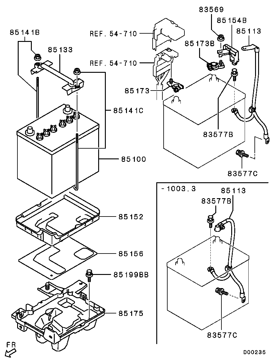 > Автомобіль: COLT/COLT PLUS (1.06.2003-3.09.2011) > Модель: 1500/2WD(4A91) /Z23W/ > Група: ЕЛЕКТРИКА КУЗОВА /54/ > Підгрупа: АКУМУЛЯТОР, ДРОТИ, КРІПЛЕННЯ /630/